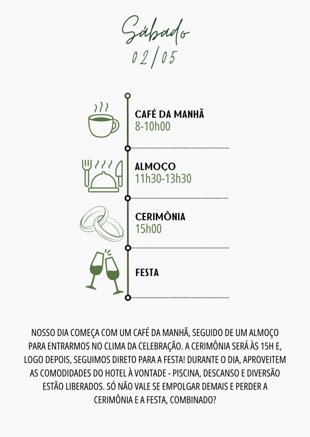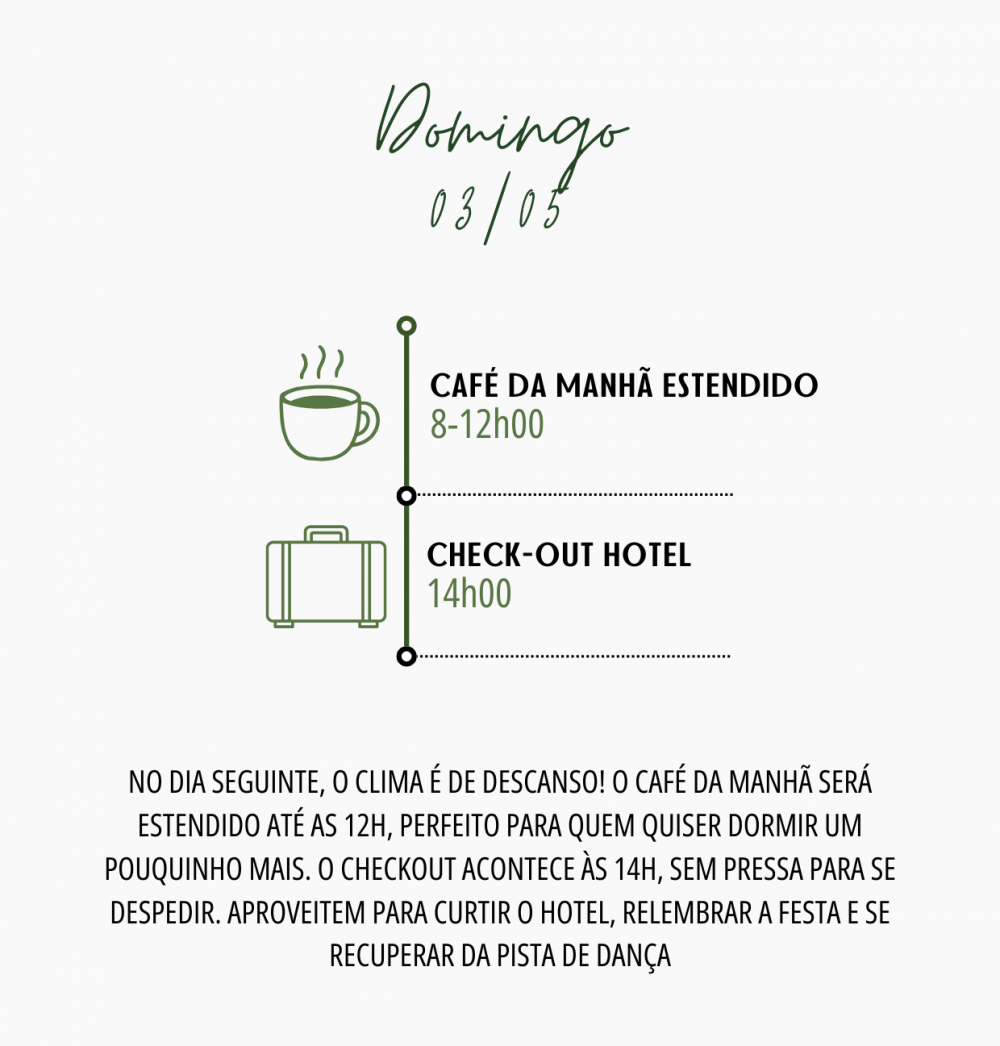 Abaixo, vocês encontrarão a programação completa para o nosso fim de semana, de sexta-feira a domingo, pensada especialmente para quem optar por se hospedar conosco. Os convidados que não estiverem hospedados poderão participar normalmente da cerimônia e da festa de casamento, no sábado.